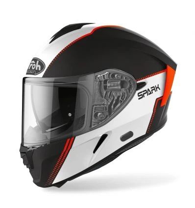 Airoh Spark With the new Airoh full-face made of HRT (High Resistant Thermoplastic) and its aggressive and aerodynamic lines, you will feel completely comfortable in every situation where there’s just the road ahead of you. Engineered in the wind tunnel and developed on 2 different external shell sizes, Spark will ignite your desire to jump on your bike, whatever your destination. Extra-Wide Visor, integrated Sun Screen Visor, Bluetooth-Ready, Stop Wind and Pinlock Lens included, complete the top-of-the-range helmet. Features: Anti-UV extra wide visor integrated sun visor Bluetooth Readiness simple and safe visor mechanism enables quick removal and installation without tools Inner lining breathable, hypoallergenic and removable Wind stop: restricts the penetration of cold from the underside and reduces internal noise Specifications: Material: thermoplastic HRT Weight: from 1490 g (+/- 50 g) Outer shell: 2 sizes (XS-S-M, L-XL-XXL) Ventilation: top, side, chin guard Closure system: Micro ratchet closure Safety standard: ECE 2205 Visor: Racing Visor Contents: 1x Airoh helmet 1x helmet bag 1x Pinlock Lens