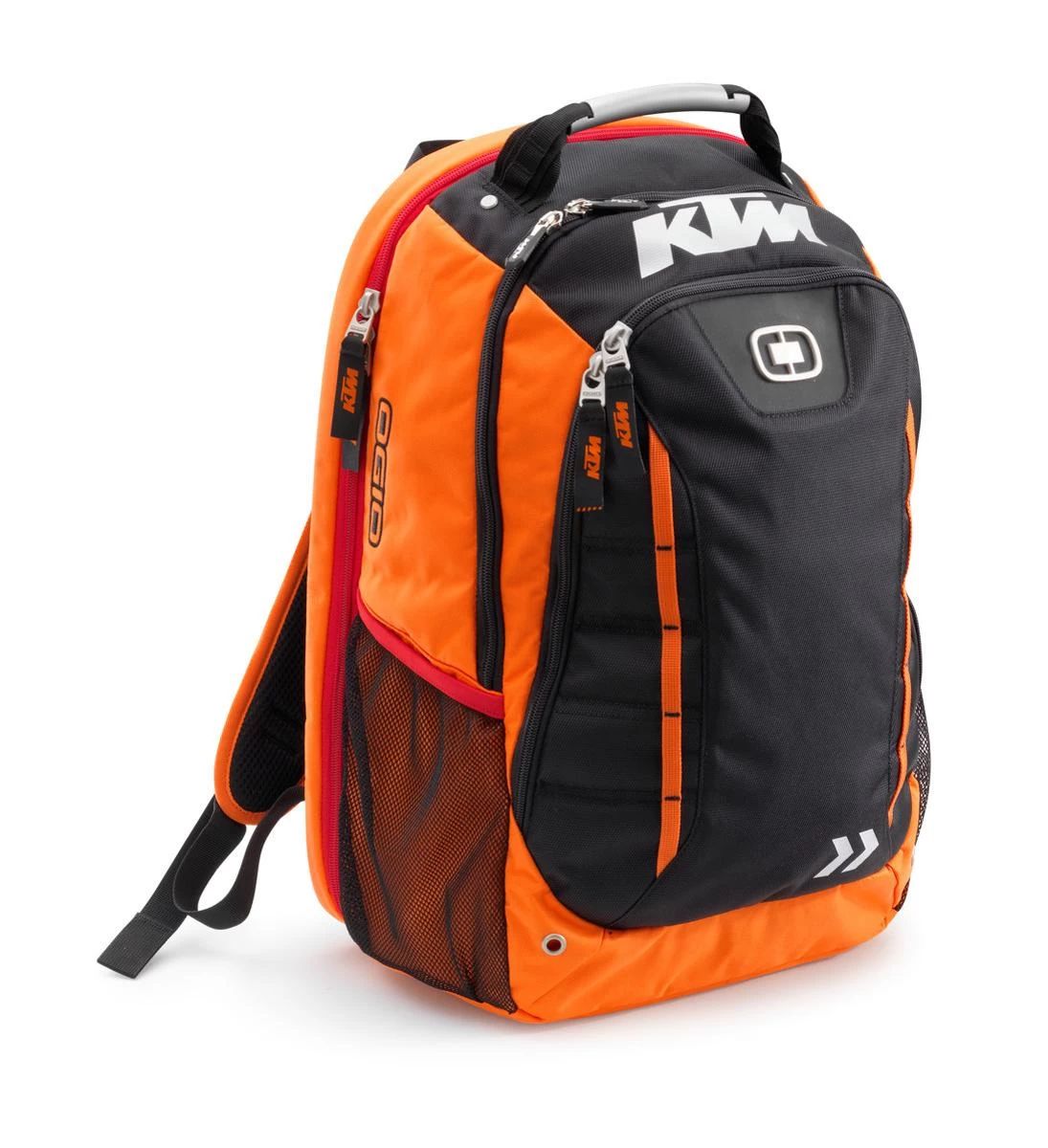 100 polyester Burly 10 zipper on main opening Front daisy chain attachment system Padded shoulder straps Breathable air flow padded back panel Airport checkpoint friendly laptop compartment fits most 15 laptops Padded iPad/tablet/e-reader sleeve Large main compartment for books binders and files Dual side mesh water bottle pockets Deluxe organization panel with key fob clip Convenient pullman handle strap Deluxe aluminum extruded easy carry top handle Special logo treatment Woven labels call out functional highlights Custom over-molded zipper pullers Weight approx. 1 kg Size approx. 47 x 32 x 22 cm Exclusively for KTM by OGIO